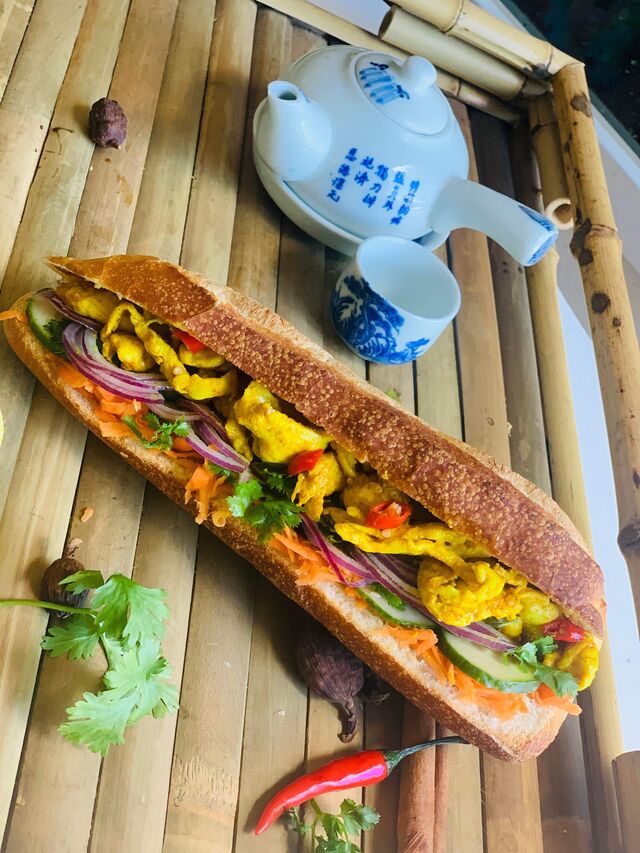 Il s’ agit d une baguette croustillant avec les garnitures . Les légumes frais et viandes marinés . Notre spécialité c’est banh mi bœuf, c est un délice !